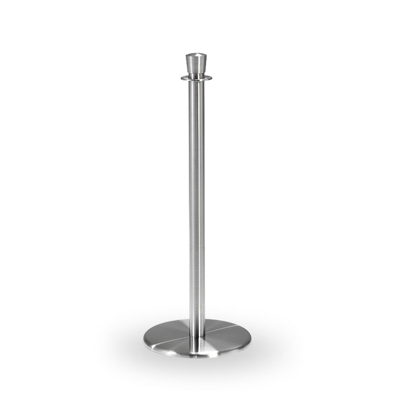 Köstolpe för avspärrningsband. Stolpen har krona och stadig fot med en finish i rostfritt stål