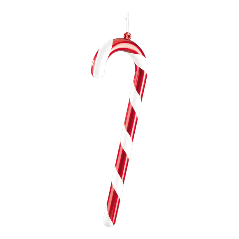 Blank polkakäpp med hänge. Gjord av plast. Röd och vitrandig.