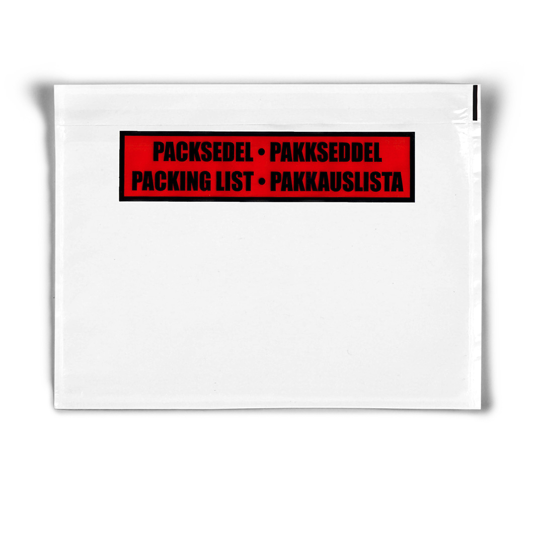 Självhäftande plastficka av polyten, för packsedlar med mera.