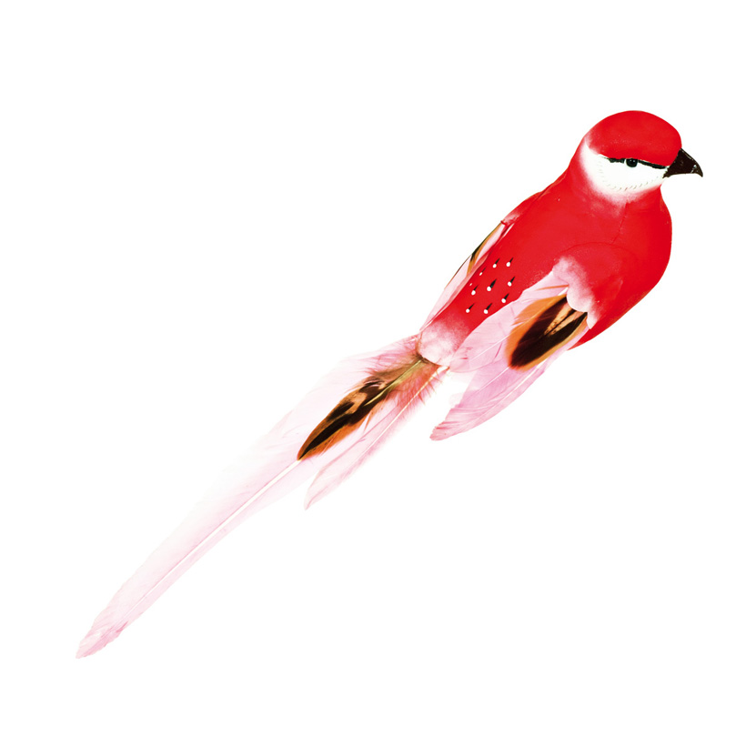 Fågel med klämma, tillverkad i frigolit med fjädrar. Storlek 40x7x7 cm, röd. Ett fint inslag i säsongs- eller temadekorationer. Ger rörelse och karaktär åt dekorationen.