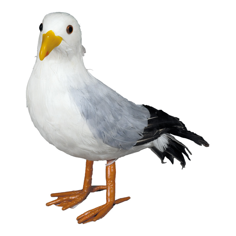Fiskmås av frigolit med fjädrar. Storlek 26x30x10 cm, vit/grå. Passar för skyltfönster eller andra miljöer som kan kombineras med andra dekorationer.