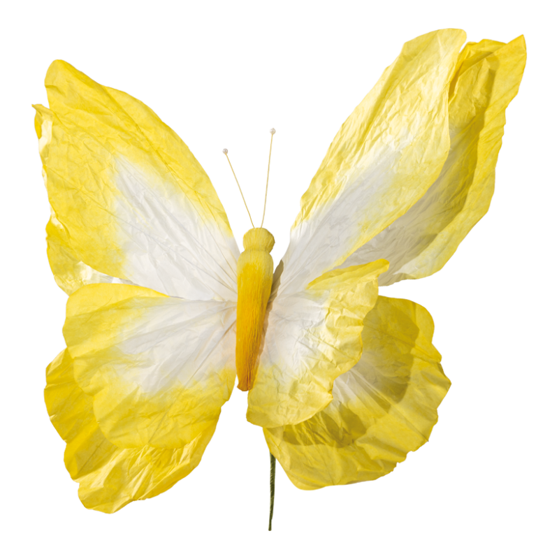 Fjäril av papper med dubbla vingar. Storlek 50x48 cm, gul/vit. Perfekt för säsongsdekorationer.