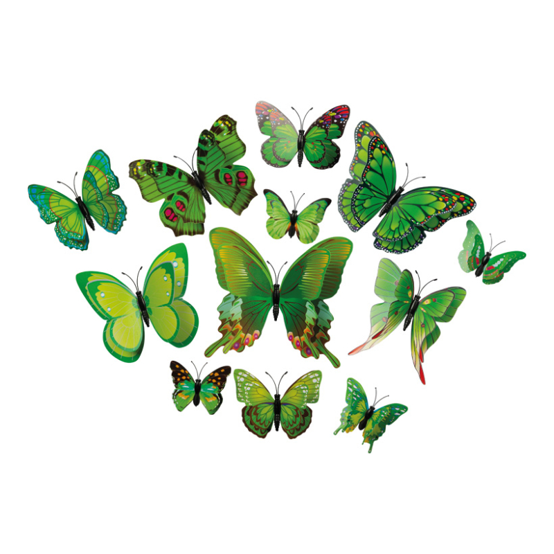 3D-fjärilar, 12 stycken, i plast, i påse, med magnet och medföljande limdots, 6–12 cm, grön