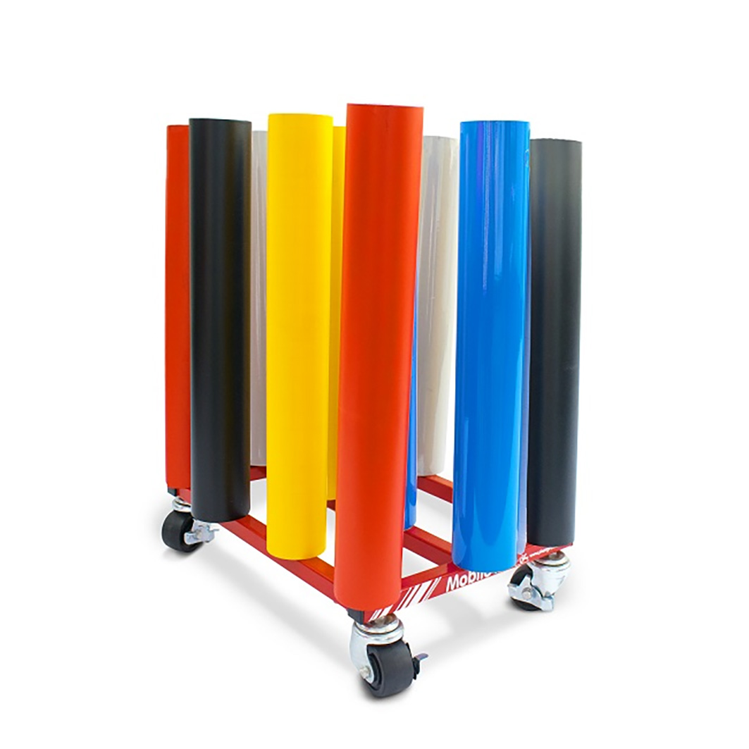 Folievagn med hjul, designad för att rymma upp till 12 rullar samtidigt. En praktisk och rörlig lösning för att organisera, lagra och transportera olika foliematerial.