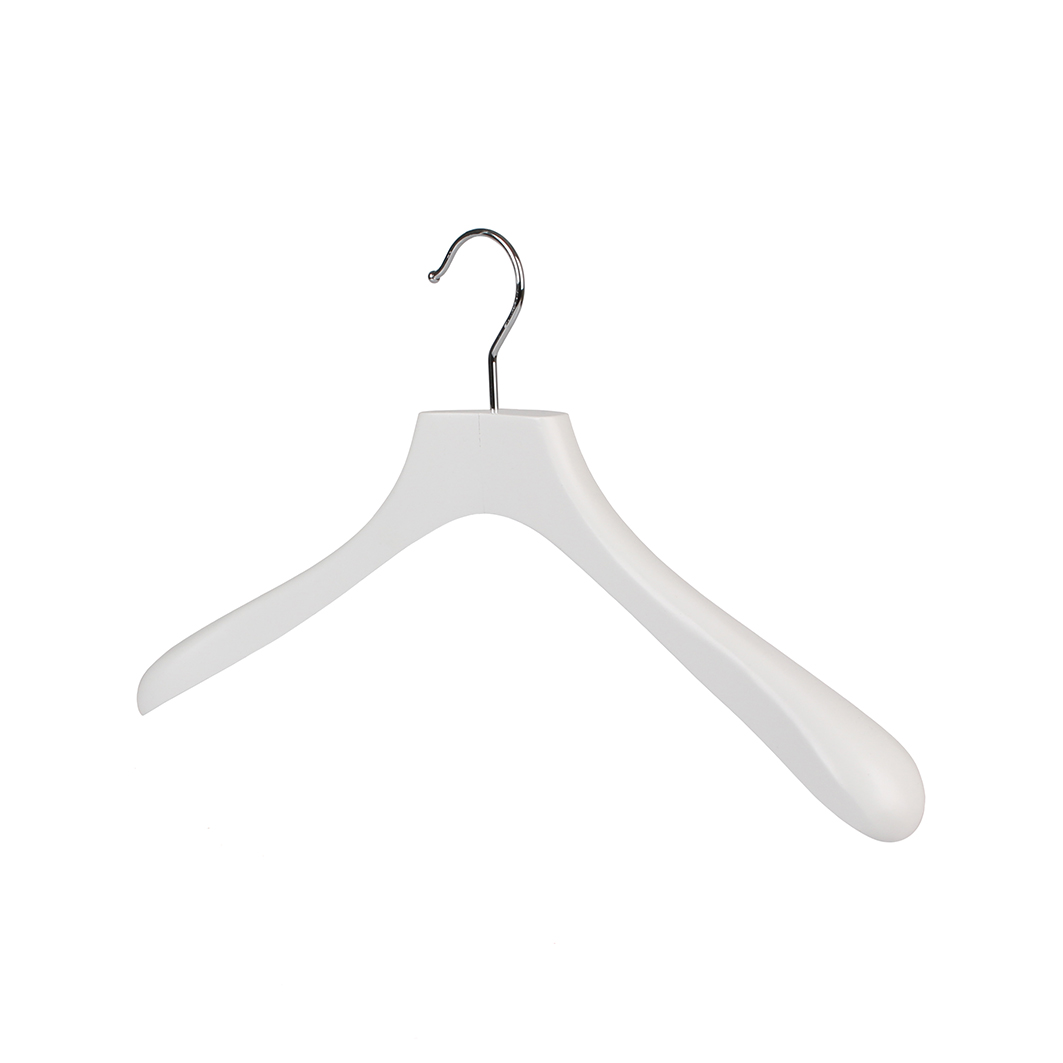 En vit trägalge speciellt designad för att hänga kavajer. Denna galge har en bredd på 43 cm, en tjocklek på 4,5 cm och en höjd på 24 cm, vilket gör den perfekt för att upprätthålla kavajers form och passform.
