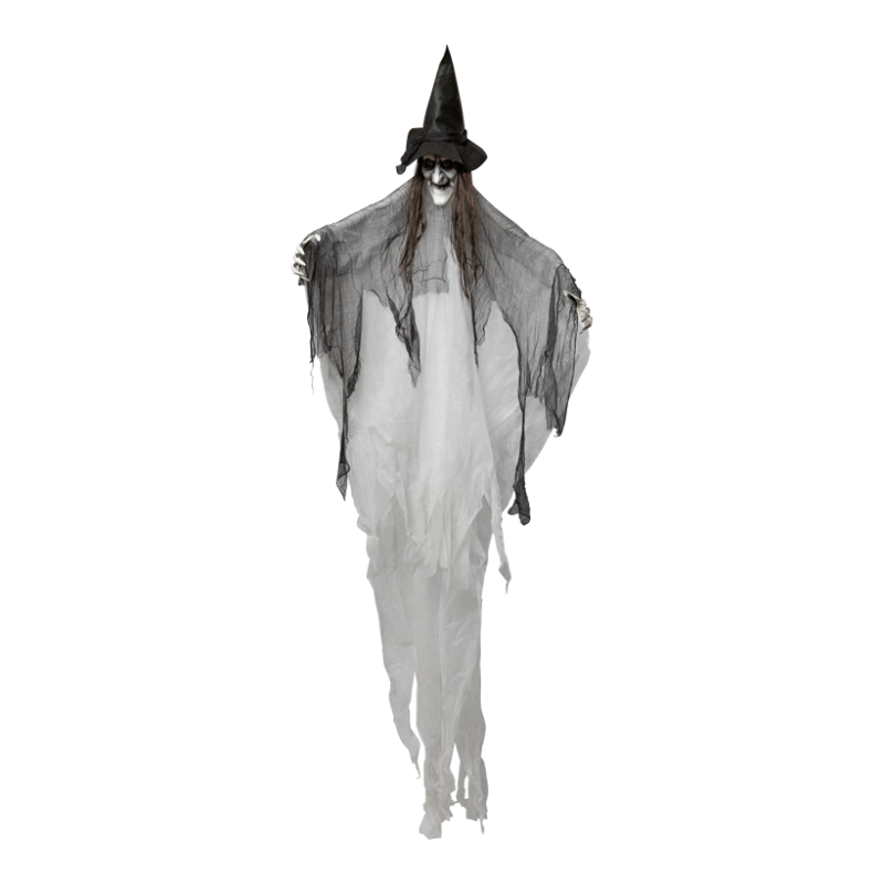 Häxa av tyg och plast, med rörliga armar och LED-belysning. Storlek 265x170x20 cm, färg vit/svart. Kräver 2 st AAA-batterier. Passar för festliga arrangemang och säsongsdekorationer, exempelvis till halloween.