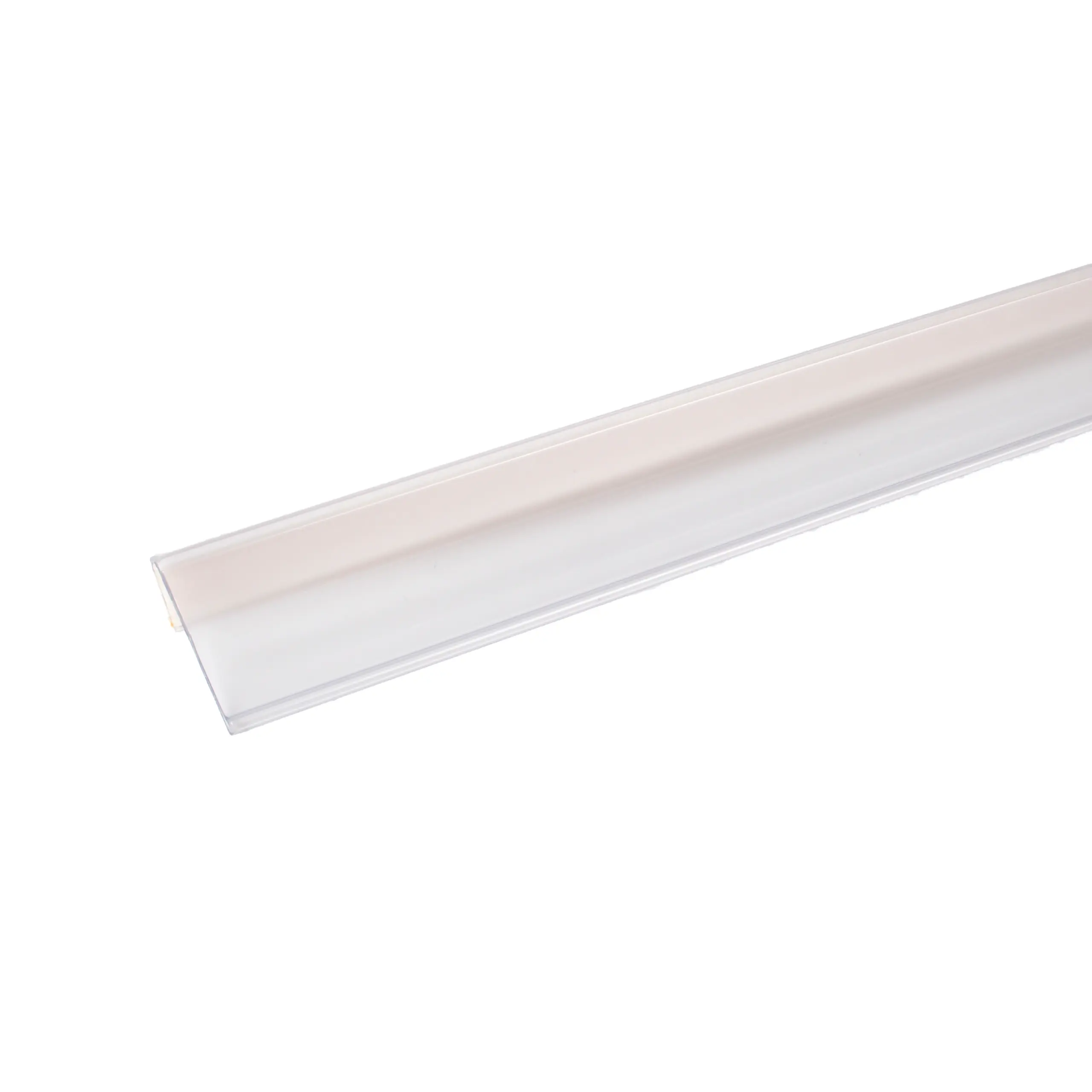 Vinklad, transparent hyllkantslist.
