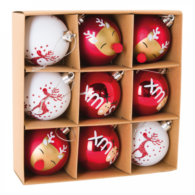 Julkula Ø 6cm, 9st/blister, med hängare röd/vit
