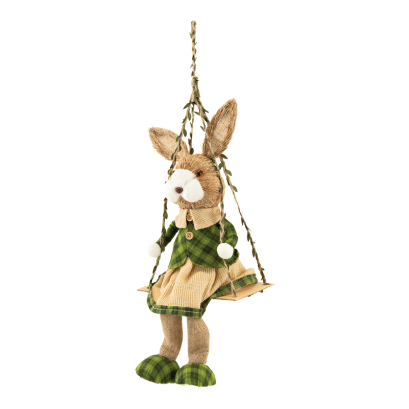Kanin på gunga, 70 × 24 × 23 cm, i syntetfiber/frigolit/halm, med klänning.