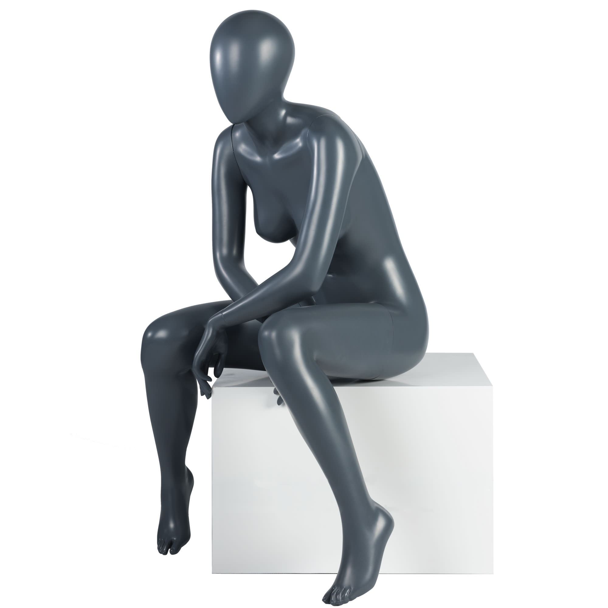 Sittande skyltdocka i helfigur med slät grå yta och abstrakt huvud utan ansiktsdrag. Modellen är utformad i en framåtlutad position med armarna vilande över benen.