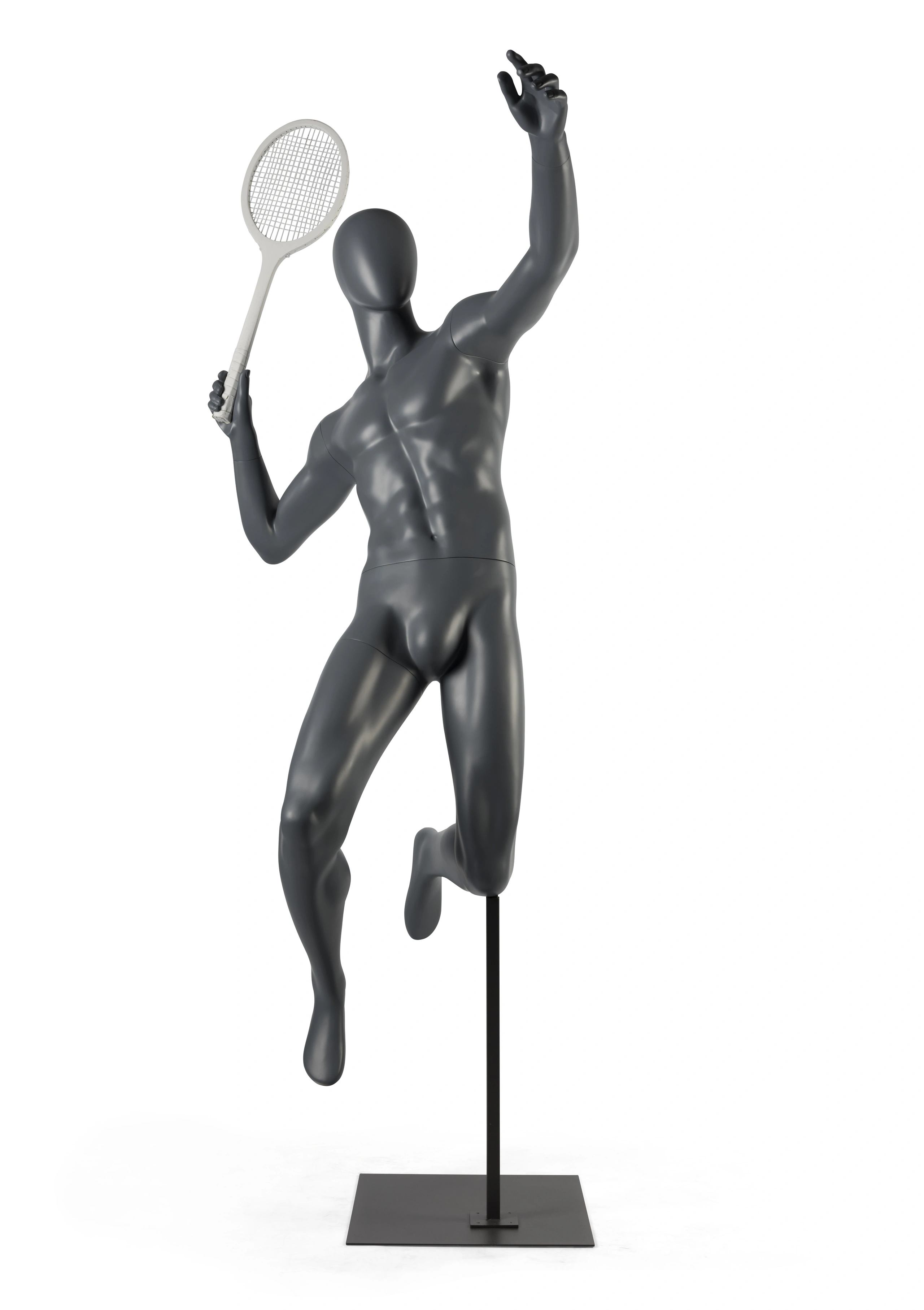 Manlig skyltdocka som spelar tennis är den perfekta tillsatsen till din sportbutiks eller tenniscentrums visuella presentation. Med racketen i handen ger den en tydlig signal om butikens fokus på racket- och bollsport.