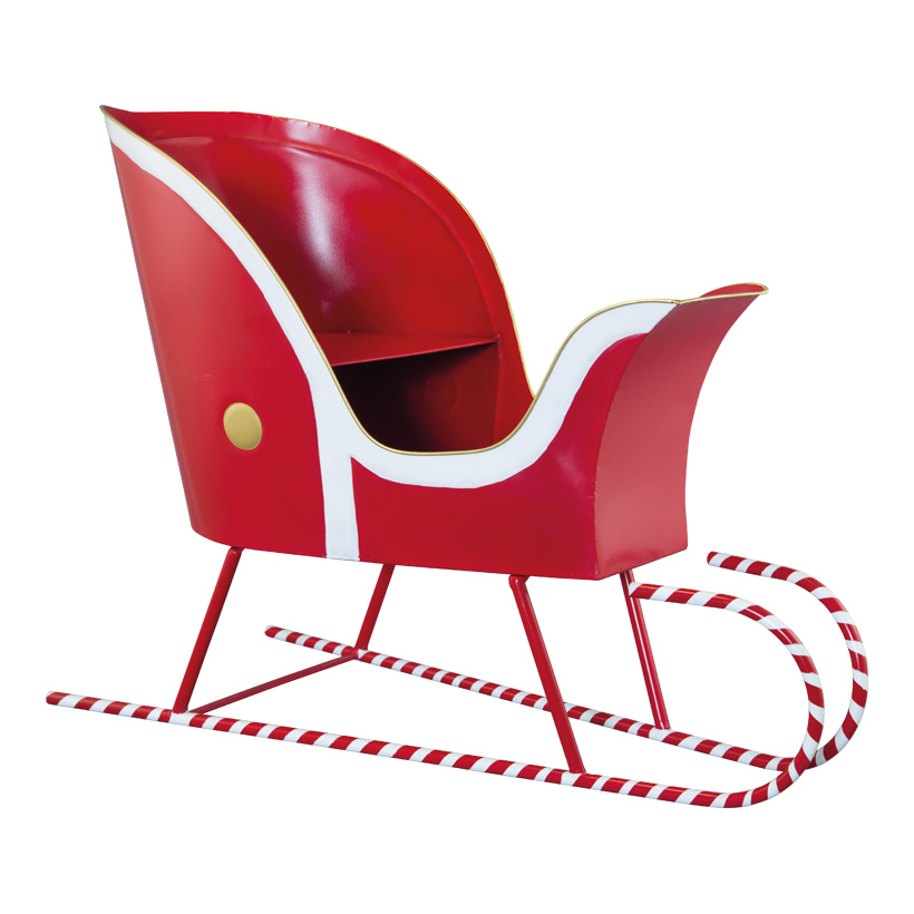 Röd och vit släde gjord av metall. 75 x 34 x 57 cm